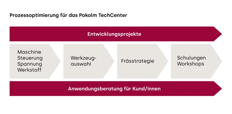 Das TechCenter von Pokolm unterstützt Kunden mit technologisch und wirtschaftlich optimierten Fräslösungen, die auf die individuellen Bedürfnisse angepasst sind und Werkzeug, Frässtrategie, Spannmittel, Fräsmaschine, CNC-Steuerung oder CAM-System betreffen können.